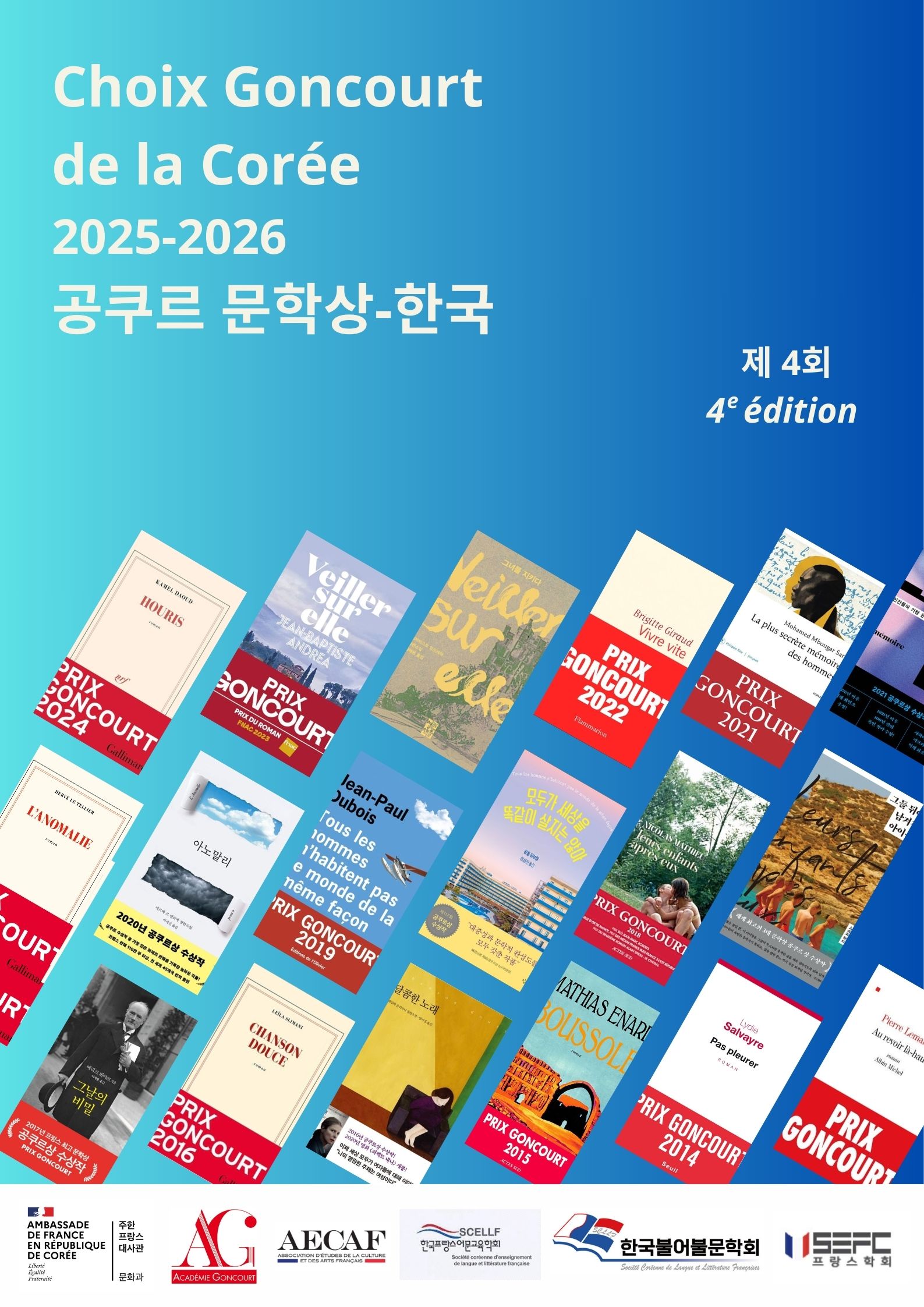 참여 희망 학생은 10월 20일(월)까지 차지연 교수님께 메일로 문의 (chazi17@cnu.ac.kr) - 참가 신청서 학생이 직접 보내는 것 아님, 지도 교수(차지연 교수님)에게 문의할 것 * 10월 20일 기준 참여 희망 의사를 밝힌 인원이 최소 4인 이상이어야 프로그램 진행 및 팀 신청 가능 * 번역본이 없는 프랑스어 원문을 직접 읽고 번역하여 심사하는 프로그램으로, B1 이상의 프랑스어 독해 능력 이상 학생에게 권장. * 팀이 구성되면 10월 말-11월 중 사전 모임 1-2회 진행 예정, 본격적인 독서 및 토론 일정은 기말고사 이후 시작 예정 제4회 «공쿠르문학상-한국» 학생 심사위원단 모집 안내 2025-2026 “공쿠르문학상-한국” 학생 심사위원단에 참여하세요! 공쿠르 문학상은 프랑스에서 가장 권위 있는 문학상으로, 현재 전 세계 40여 개국에서 “국제 공쿠르상” 형태로 진행되고 있습니다. 한국에서는 올해로 4회째를 맞이하며, 아카데미 공쿠르와 협력하여 진행됩니다. 학생 심사위원으로 참여하면 프랑스 현대 문학 작품을 직접 읽고, 토론과 분석을 통해 다양한 의견을 나누는 소중한 경험을 쌓을 수 있습니다. 국내 대학, 어학센터, 알리앙스 프랑세즈 등에서 프랑스어를 공부하는 학생들은 아카데미 공쿠르가 선정한최종 후보작 4권을 여러 달에 걸쳐 읽고 분석하게 됩니다. 또한, 이번 행사에서도 프랑스 홍보작가와 직접 만날 수 있는 특별한 기회도 마련됩니다. 참여방법